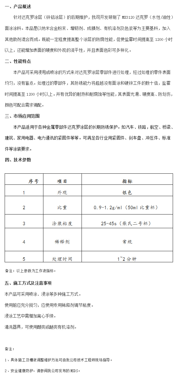 產品名稱:MX3120達克羅面涂涂料(銀色)