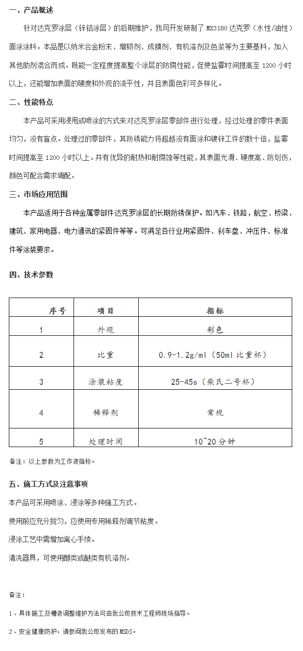產(chǎn)品名稱:MX3180達(dá)克羅面涂涂料(彩色)